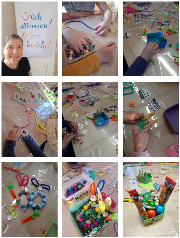 Mit viel Begeisterung wurde geschnitten, geklebt, gemalt und gelacht. Die Kinder – und ebenso die Erwachsenen – tauchten in eine Welt voller Farben und Fantasie ein. Entstanden sind dabei liebevoll gestaltete Osterdekorationen, lustige Hasen, süße Küken und kreative Osternester.