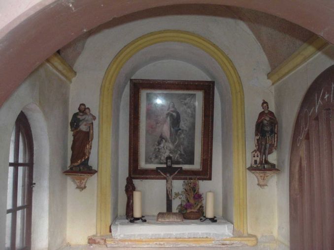 Über dem Eingangstor befindet sich ein vierfärbig verglastes Rundfenster, durch das Licht auf die Mariendarstellung fällt, und von den Seiten lassen zwei vergitterte und mit Blumenkisterln geschmückte Rundbogenfenster die Helligkeit auf den Fliesenboden herein. Rund um die Kapelle wurden Steinplatten verlegt und das Ziegeldach wird von einem wunderbaren gusseisernen Kreuz gekrönt.