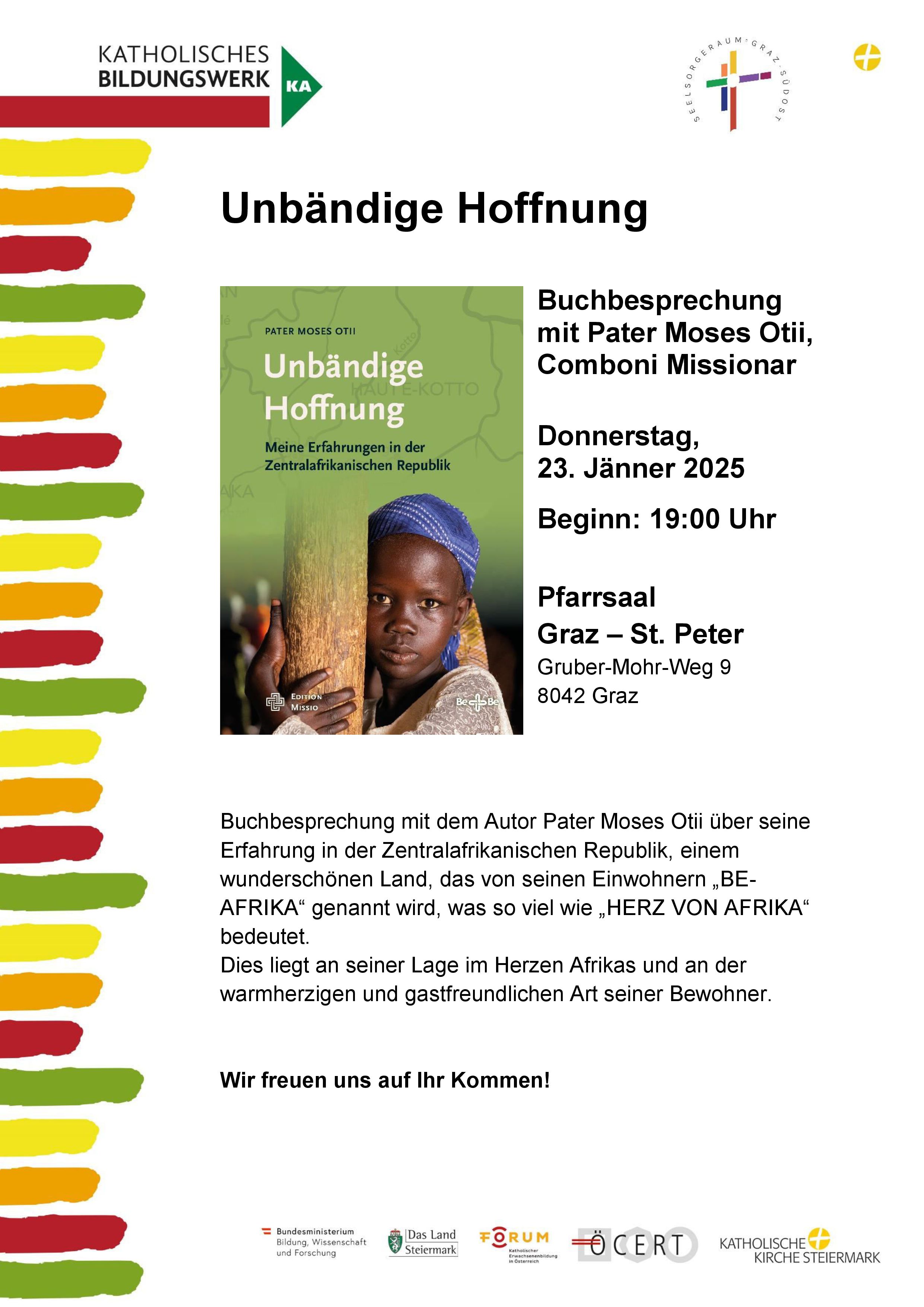 P. Moses Otii (44) stammt aus Uganda, hat in Innsbruck Theologie studiert und war zehn Jahre lang Pfarrer der Pfarrei „Unsere liebe Frau von Fatima“ in Bangui, der Hauptstadt der Zentralafrikanischen Republik. Während eines Rebellenangriffs auf seine Kirche erlebte er ein Massaker, bei dem 20 Menschen ums Leben kamen. Heute wirkt er als Seelsorger im Seelsorgeraum Graz-Südost und schreibt seine Doktorarbeit.