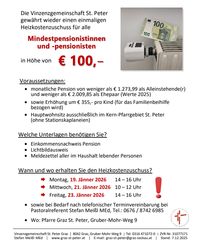 Die Vinzenzgemeinschaft St. Peter zahlt im Jänner 2026 im Zuge ihrer traditionellen Heizkostenaktion wieder einen einmaligen Zuschuss in der Höhe von € 100,– an Bezieher:innen einer Mindestpension.