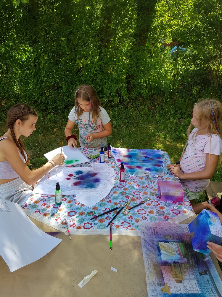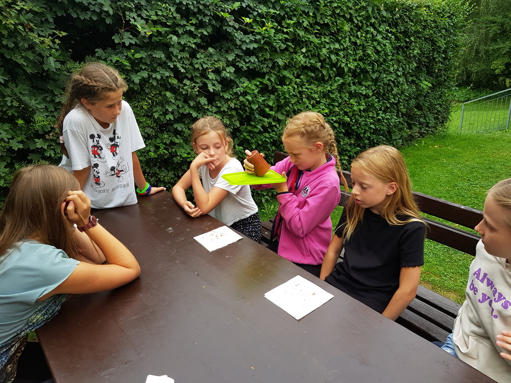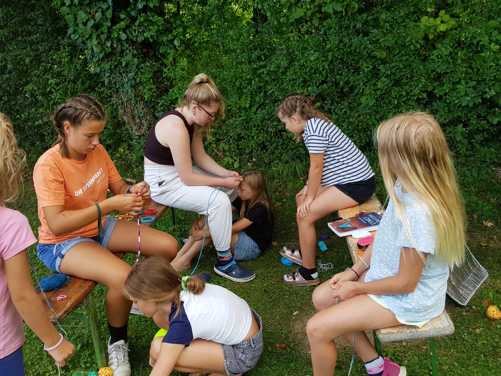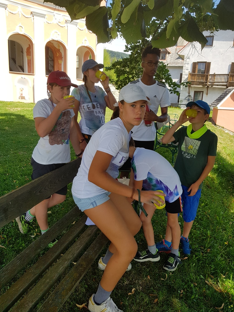 Dazwischen gab es Spiele im Wald (Waldhaus/Burgen bauen, Burgenspiel, Roter Elch, Pfeiferlspiel) und auf die Wiese (Fußball, Volleyball, Wikingerschach, Tischtennis, Olympische Spiele) oder Bastelstationen (T-Shirts, Buffs und Schachteln bemalen/bedrucken, Haarbänder einflechten, Freundschaftsbänder knüpfen, Salben herstellen, Steinschleuder basteln), meist im Freien. Einmal wanderten wir auf den Schöckel und eine Schatzsuche führte uns am Gedenktag der Heiligen Radegundis über den Kalvarienberg zur Kirche von St. Radegund.