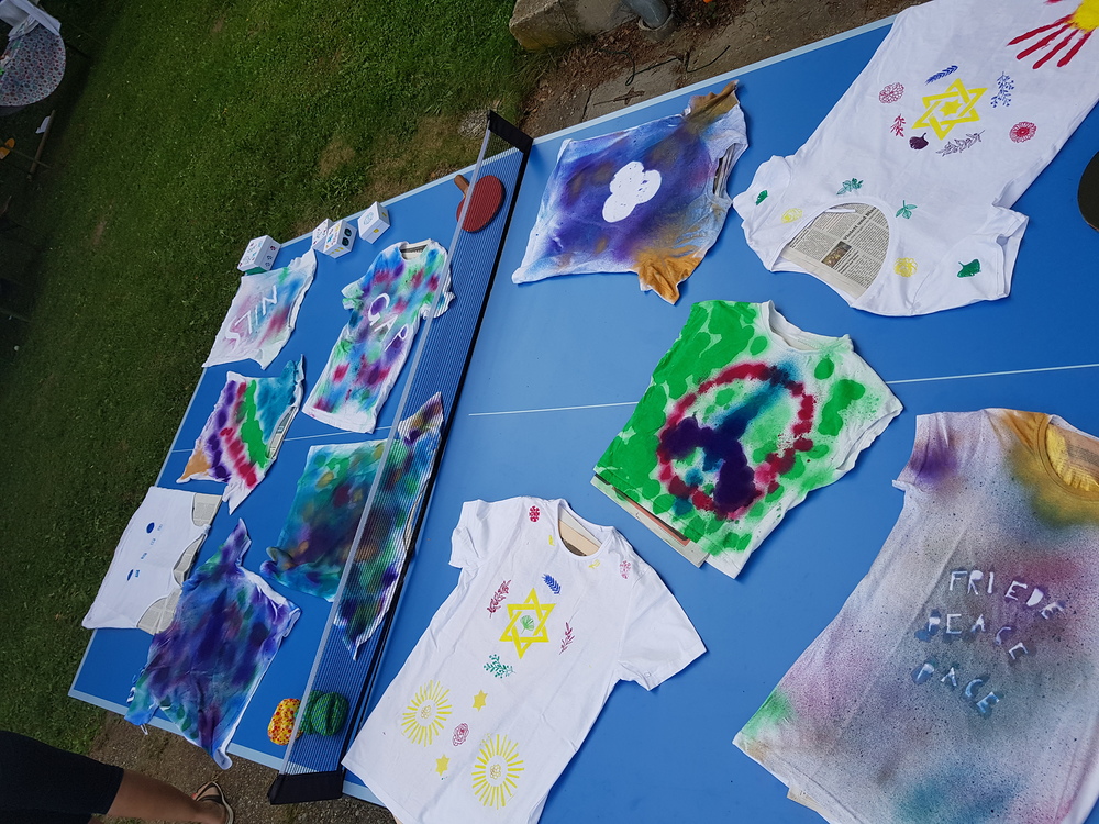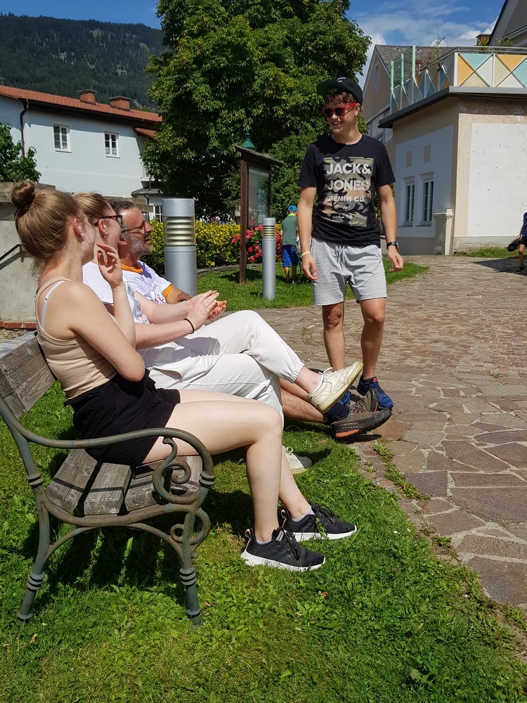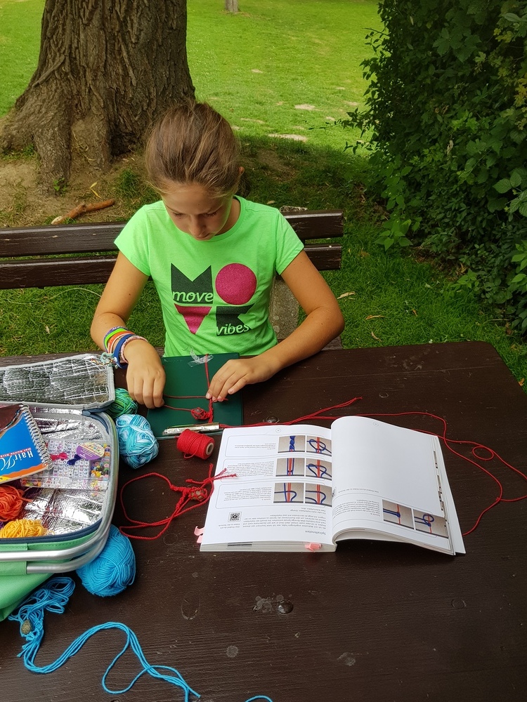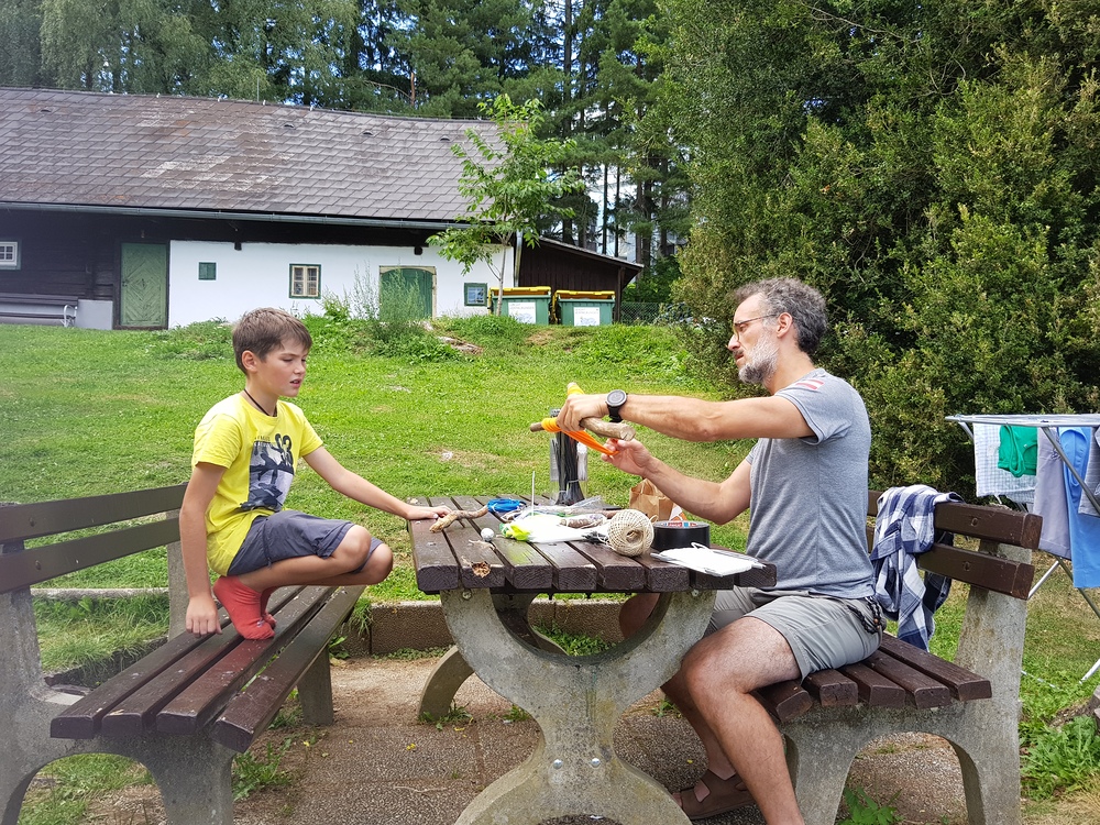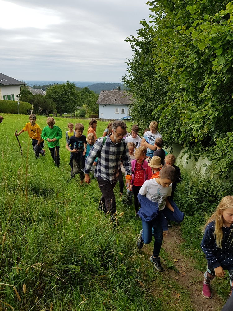 Dazwischen gab es Spiele im Wald (Waldhaus/Burgen bauen, Burgenspiel, Roter Elch, Pfeiferlspiel) und auf die Wiese (Fußball, Volleyball, Wikingerschach, Tischtennis, Olympische Spiele) oder Bastelstationen (T-Shirts, Buffs und Schachteln bemalen/bedrucken, Haarbänder einflechten, Freundschaftsbänder knüpfen, Salben herstellen, Steinschleuder basteln), meist im Freien. Einmal wanderten wir auf den Schöckel und eine Schatzsuche führte uns am Gedenktag der Heiligen Radegundis über den Kalvarienberg zur Kirche von St. Radegund.