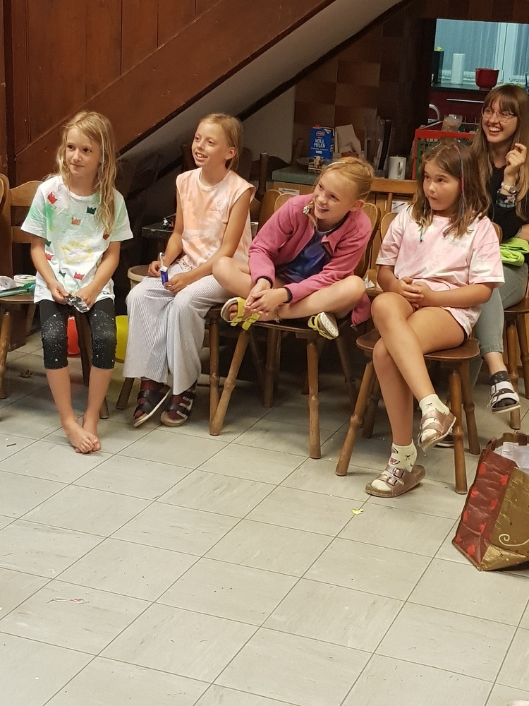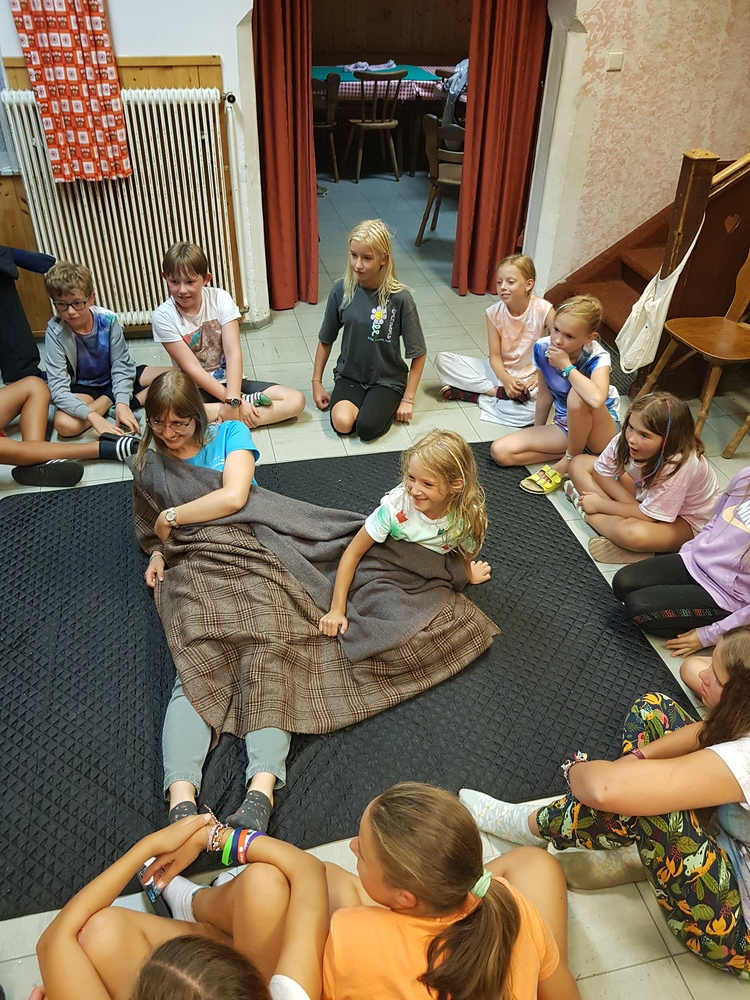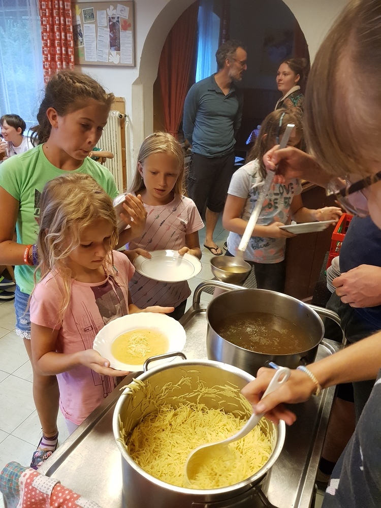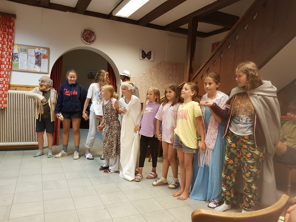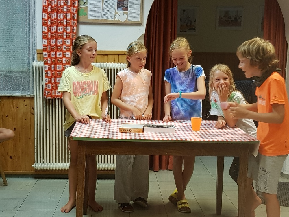 Am Sonntag starteten wir das Jungschar- und Minilager - gemeinsam mit den Eltern - mit einem Gottesdienst. Dann wurden die Eltern verabschiedet und die Zimmer bezogen. Nach Kennenlernspielen und einer Einstimmung zum Lagerthema "König David" wurden die 4 Gruppen (Ichtys = Fisch, Astron = Stern, Kinora = Harfe, Royals = königliche Familie) eingeteilt, die die ganze Woche gemeinsam die Dienste verrichteten (Küchendienst, Kehren, Bad+WC, Gebet und Tagesrückblick). Am Abend erzählte Giovanni eine Geschichte von König David und nach einem Abendgebet und dem Zähneputzen fielen alle müde ins Bett.