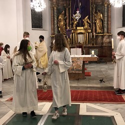 Am Palmsonntag feierten bei Sonnenschein viele große und kleine Menschen gemeinsam ein wirklich schönes Fest. Es begann mit der Palmweihe beim Friedhof mit em. Generalvikar Helmut Burkard, Diakon Fritz Hirzabauer, zwölf Ministrantinnen und Ministranten und zwei Ritter vom Heiligen Grab zu Jerusalem. Nach der Palmprozession teilten sich die Mitfeiernden auf: die Erwachsenen gingen zur Heiligen Messe in die Kirche und die Kinder zogen mit ihren Eltern zum Pfarrgarten zur WortGottesFeier, bei der sie gemeinsam auch den Weg Jesu vom Letzten Abendmahl bis zur Auferstehung darstellten. Vor und nach den Gottesdiensten gab es beim Ostermarkt köstliches Germteiggebäck und Nudeln vom Sozialkreis, Weihkorbdecken von der Bastelrunde und Olivenöl aus dem Heiligen Land.