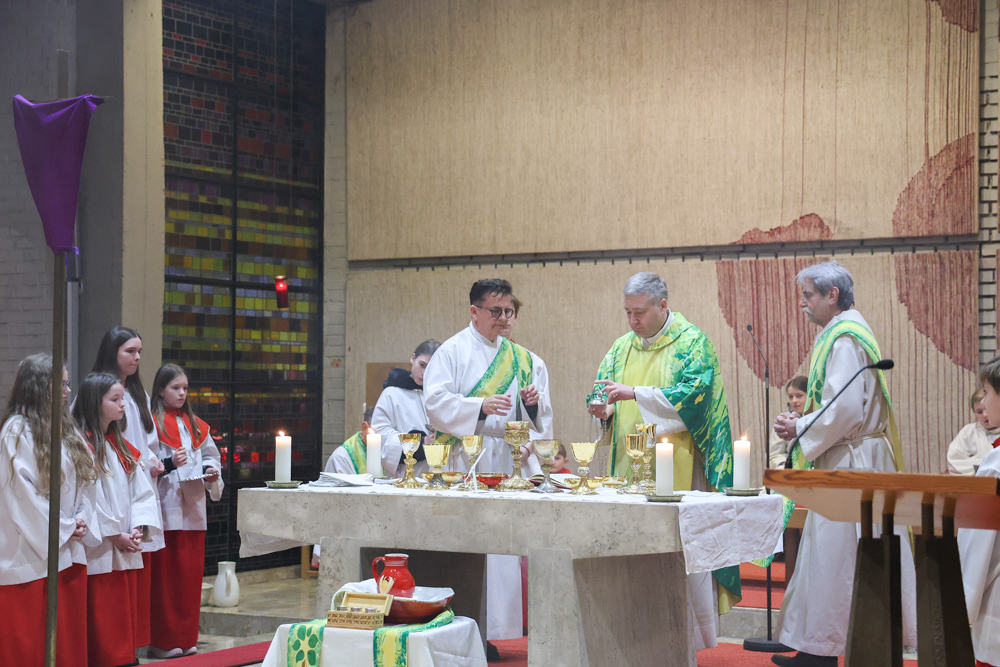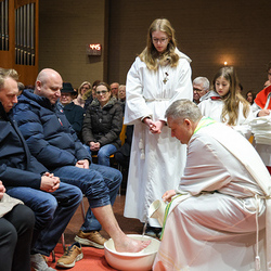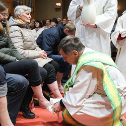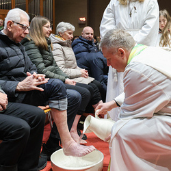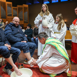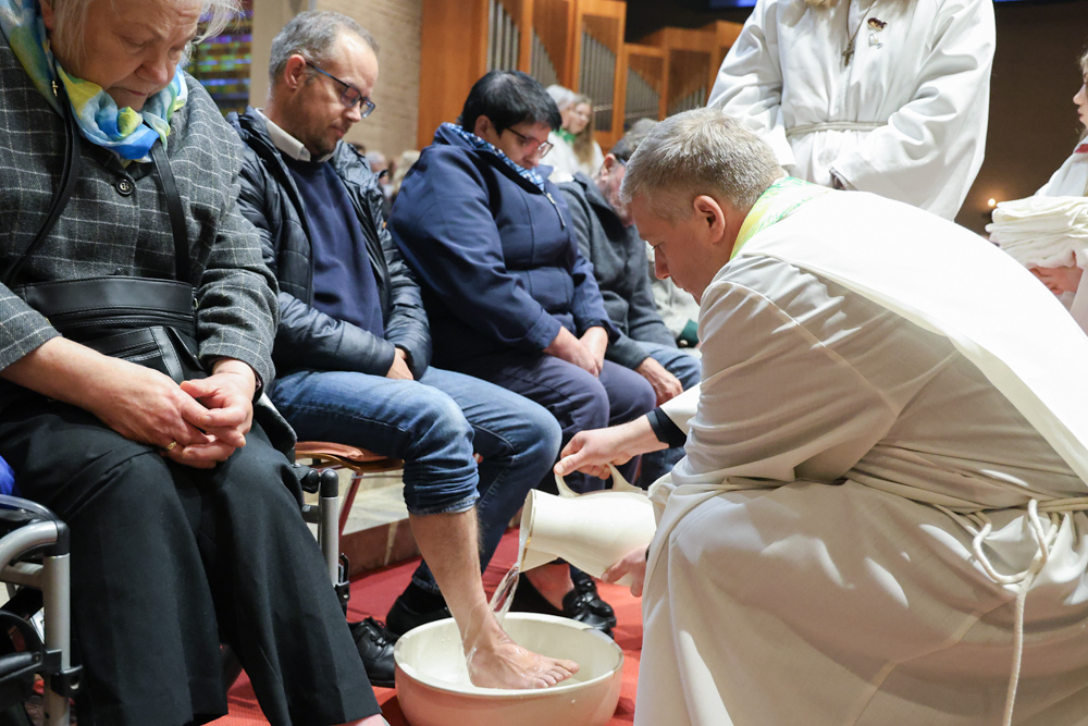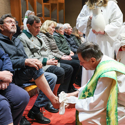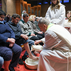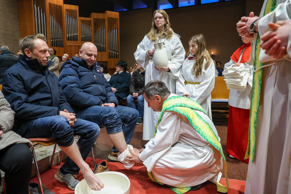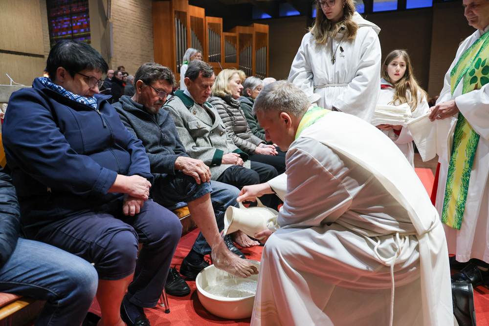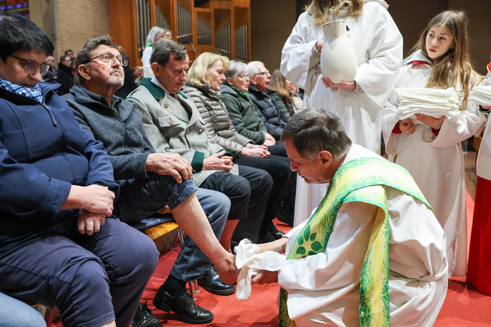 Bei diesem Mahl nahm Jesus das Brot, brach es, reichte es seinen Jüngerinnen und Jüngern und sagte: „Das ist mein Leib, der für euch hingegeben wird.“ Doch Jesus ging noch einen Schritt weiter: Er wusch die Füße seiner Freunde – nicht als Zeichen von Macht, sondern von Liebe und Dienstbereitschaft. Deshalb wurden stellvertretend zwei Personen jeder Pfarre von Pfarrer Claudiu Budău und Diakon Franz Habith die Füße gewaschen.