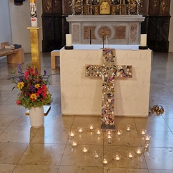 Die Lichter vor dem bunten Kreuz künden von der Wort-Gottes-Feier, die Elisabeth Schöpf am 9. Juni, dem Vatertag, in unserer Kirche gestaltete.